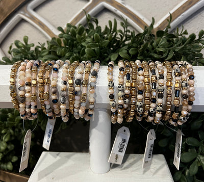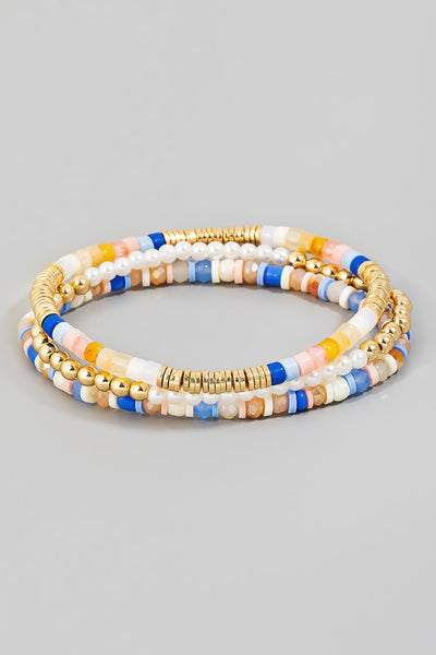 Regular price $13.99 Save $-13.99Set of stretch bracelets featuring, gold, pearl, blues and neutral beads.