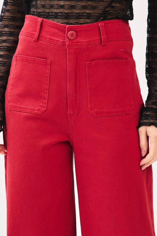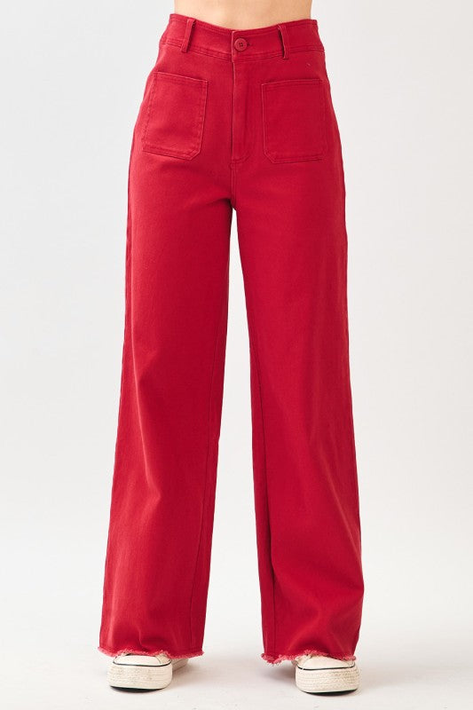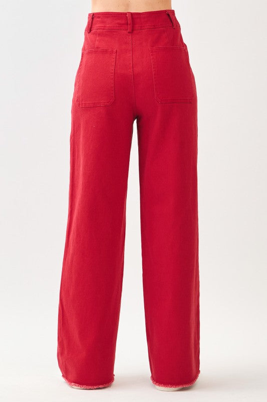 Regular price $48.00 Save $-48.00- TWILL WOVEN FABRIC - STRAIGHT WIDE LEG FIT - HIGH WAISTED - FRONT AND BACK PATCH POCKETS - FRAYED HEM - ZIP FLY WITH BUTTON CLOSURE MODEL IS 5'9" AND IS WEARING SIZE SMALL 97% COTTON, 3% SPANDEX