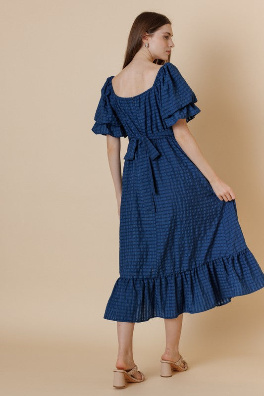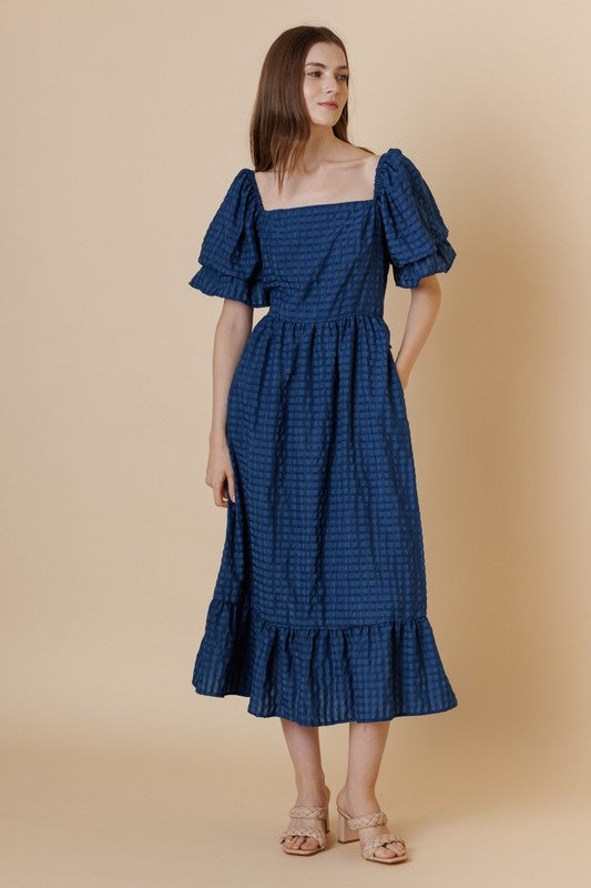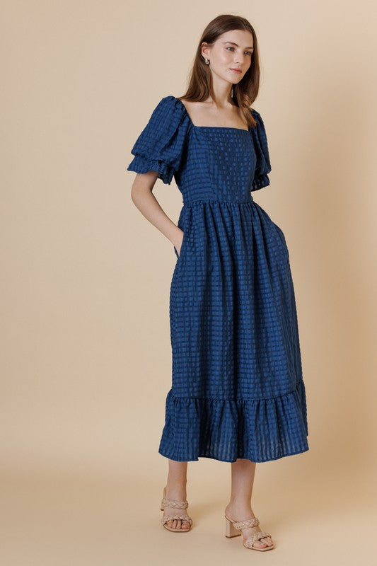 Regular price $56.00 Save $-56.00A timeless textured midi dress designed with puff sleeves, square neckline, and ruffle hem for an elegant yet modern look.