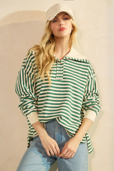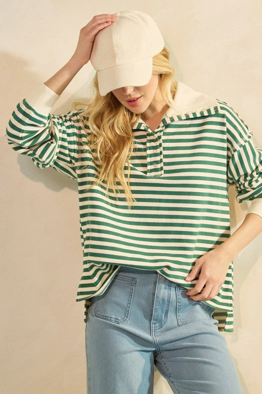 Striped Print Henley Oversized Collar Pullover