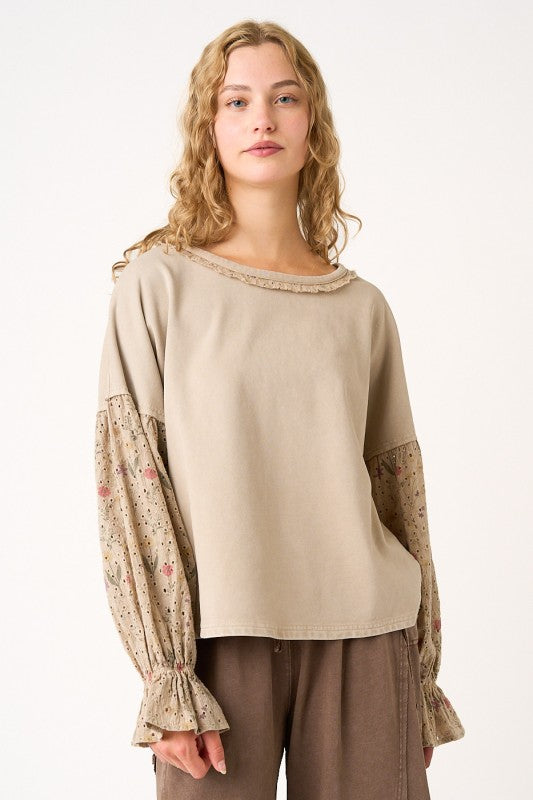 Floral Eyelet Mixed Media Relaxed Long Sleeve Top