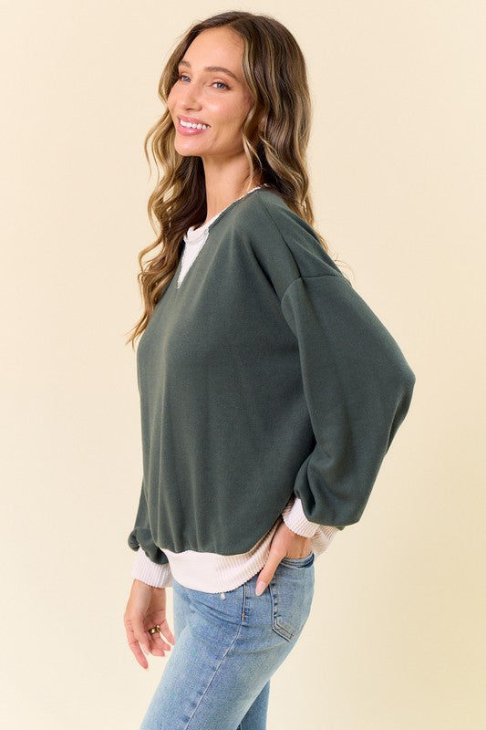 Lettuce Hem Long Sleeve Ribbed Knit Sweater Top