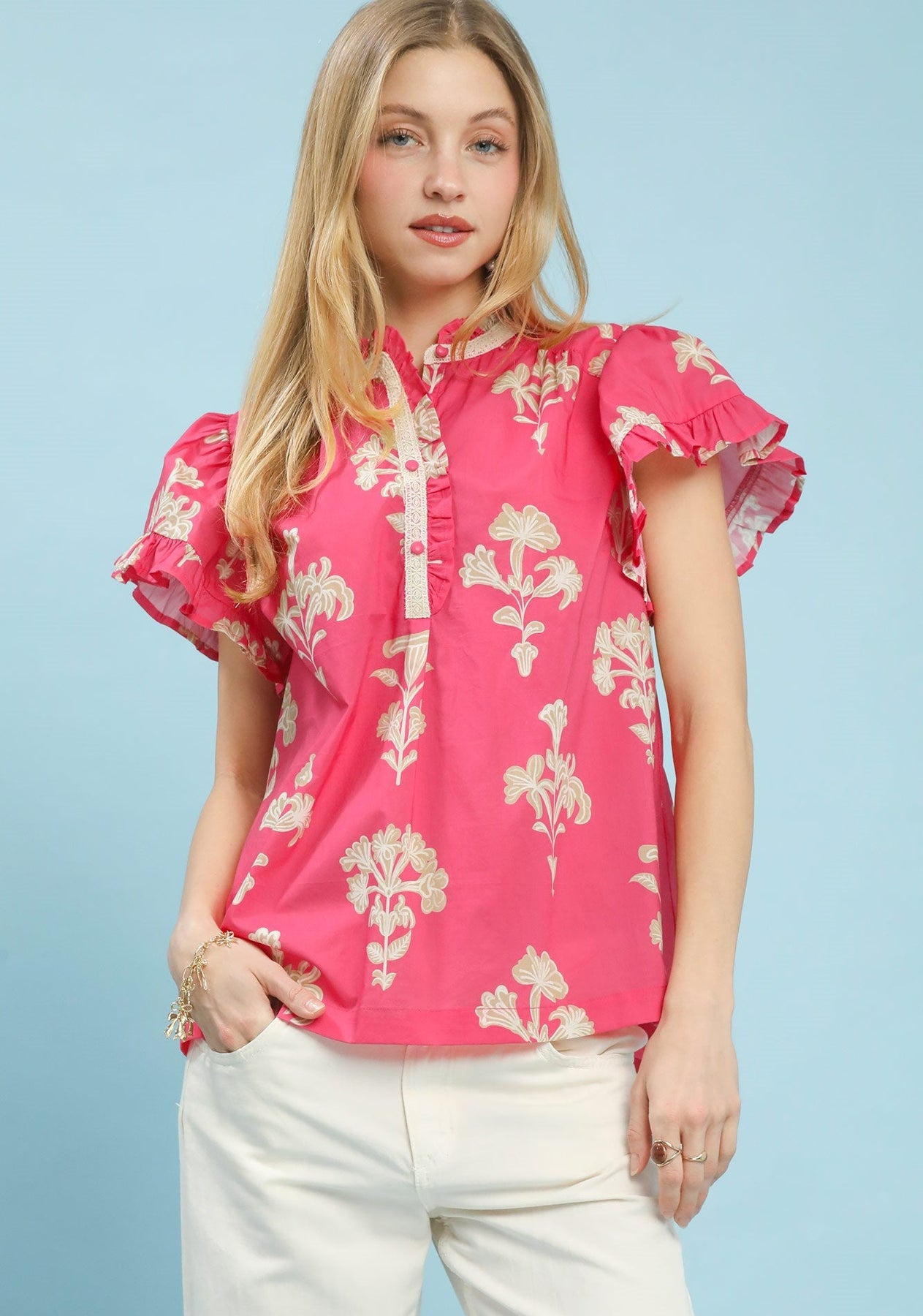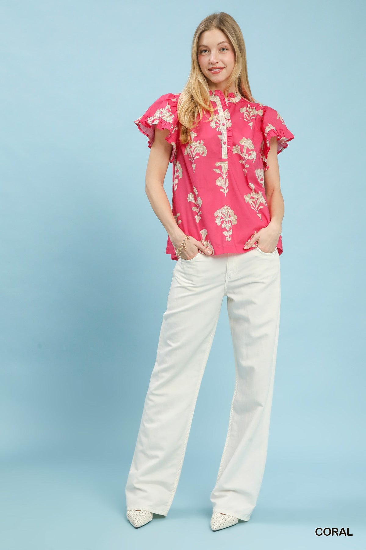 Spring into Action Floral Ruffle Sleeve Split-Neck Top