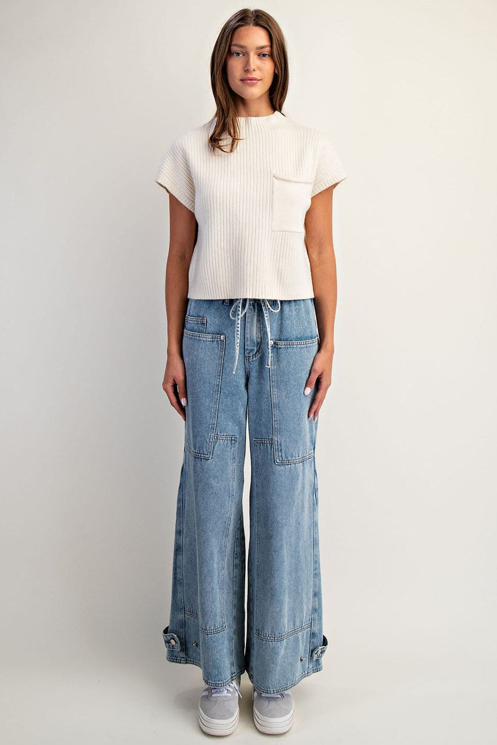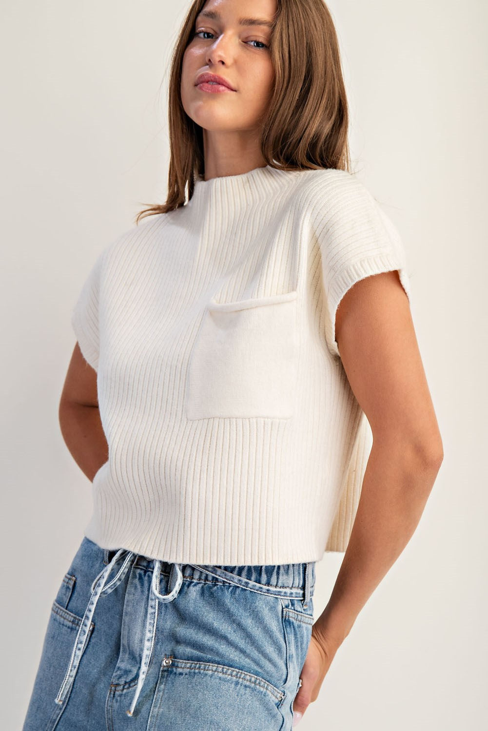 Regular price $44.00 Save $-44.00This ribbed knit sweater features a structured mock neckline, relaxed cap sleeves, a single chest patch pocket with folded edge detailing, and a boxy cropped silhouette for a modern, minimalist look.