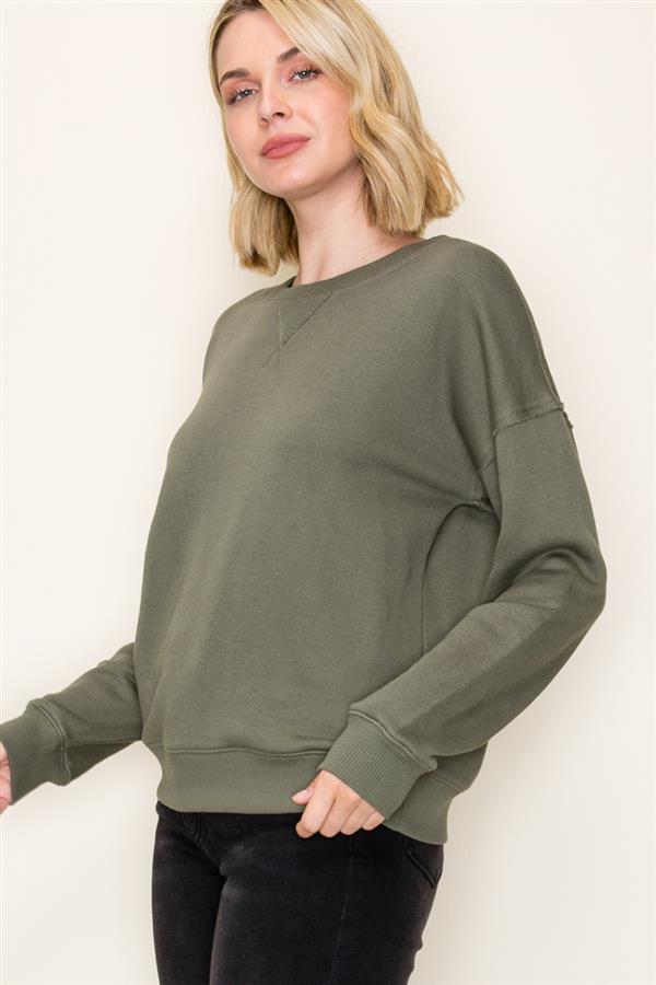 - Relaxed fit / Oversized - Round neckline - Long sleeve - Raglan sleeve - Oversized sleeve - Raw edge details Model is 5'9" and wearing size Small.