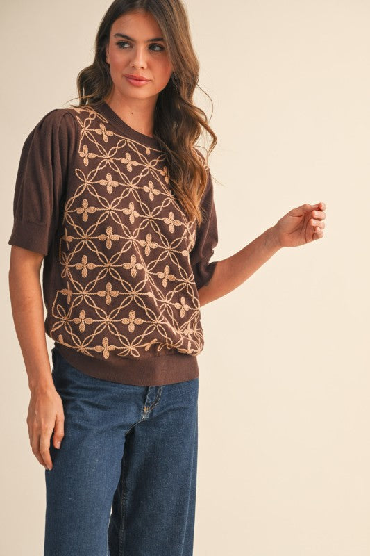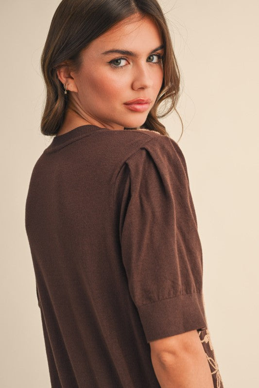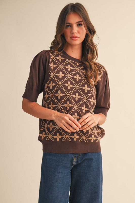 Regular price $46.00 Save $-46.00+ Short puff sleeve embroidered sweater + Round neckline + Short puff sleeves + Relaxed fit pullover + Lightweight knit + All-over embroidery design on front + Ribbed neckline, cuffs, and hem
