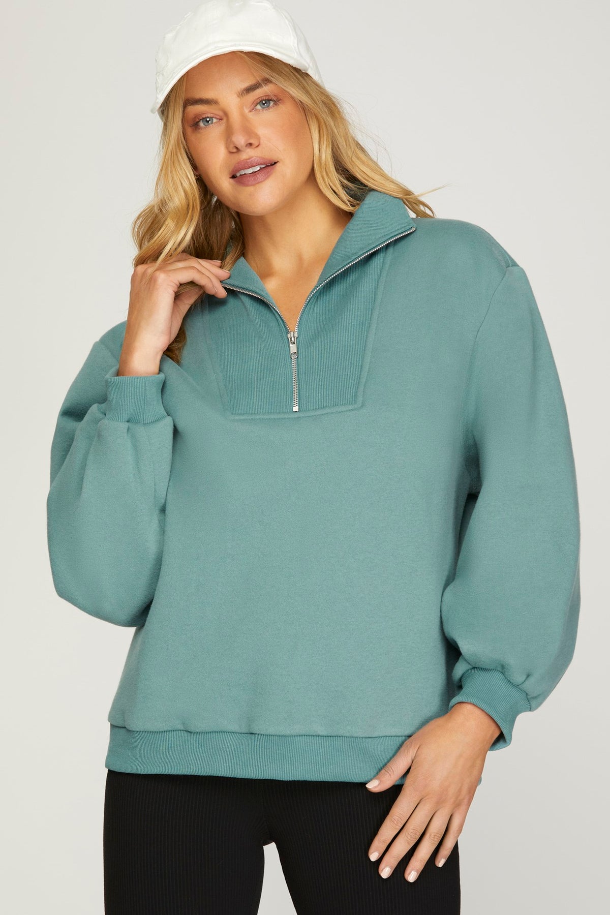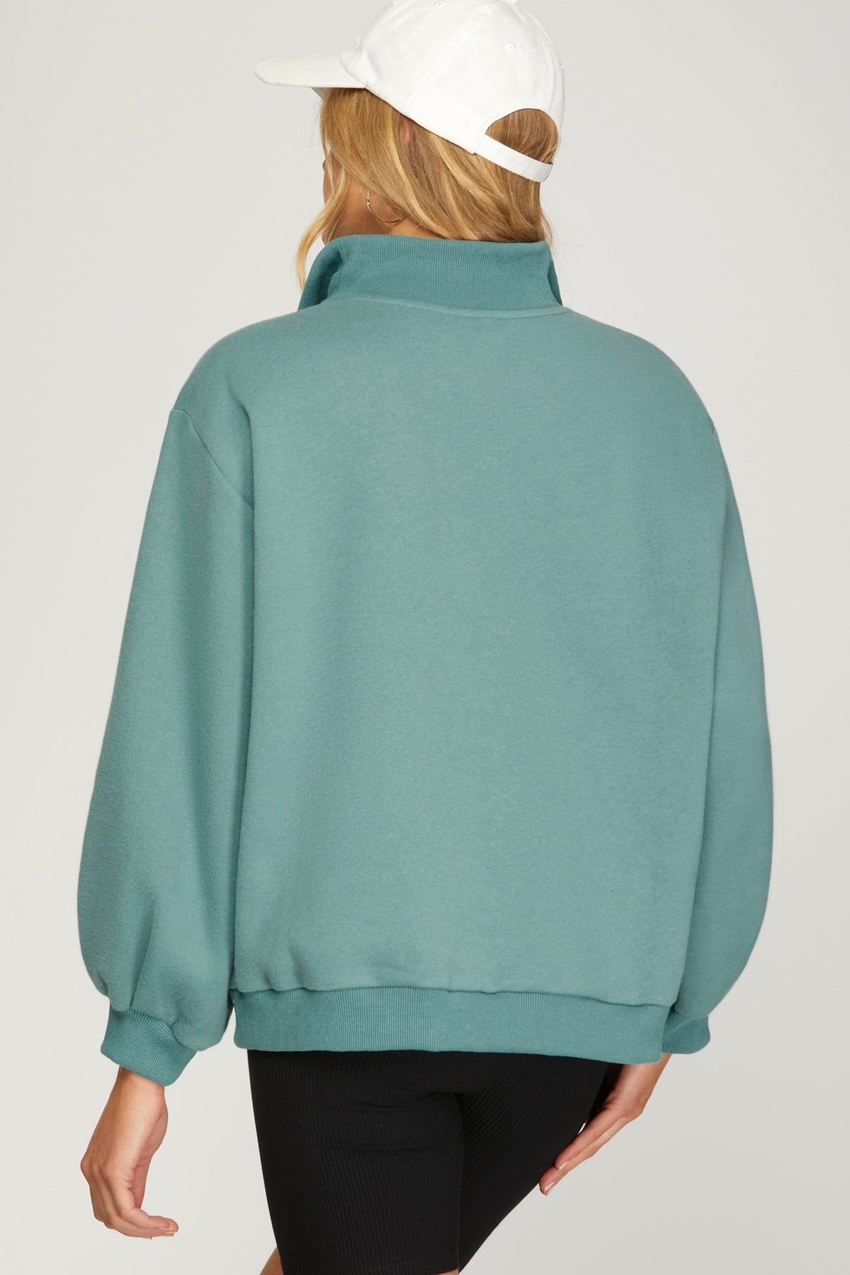 Regular price $44.00 Save $-44.00Drop shoulder mock neck sweater top with side slit detail. - Model is 5'8'' and is wearing a Small