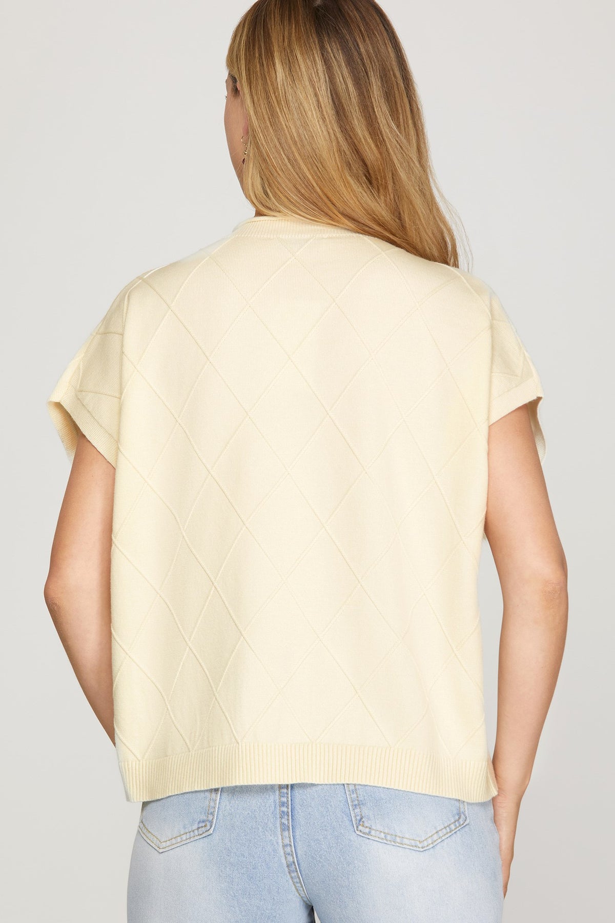 Regular price $34.00 Save $-34.00Solid knit top featuring a round neckline, short sleeves with curved cuff detail, and side slit hem for a relaxed, modern look.
