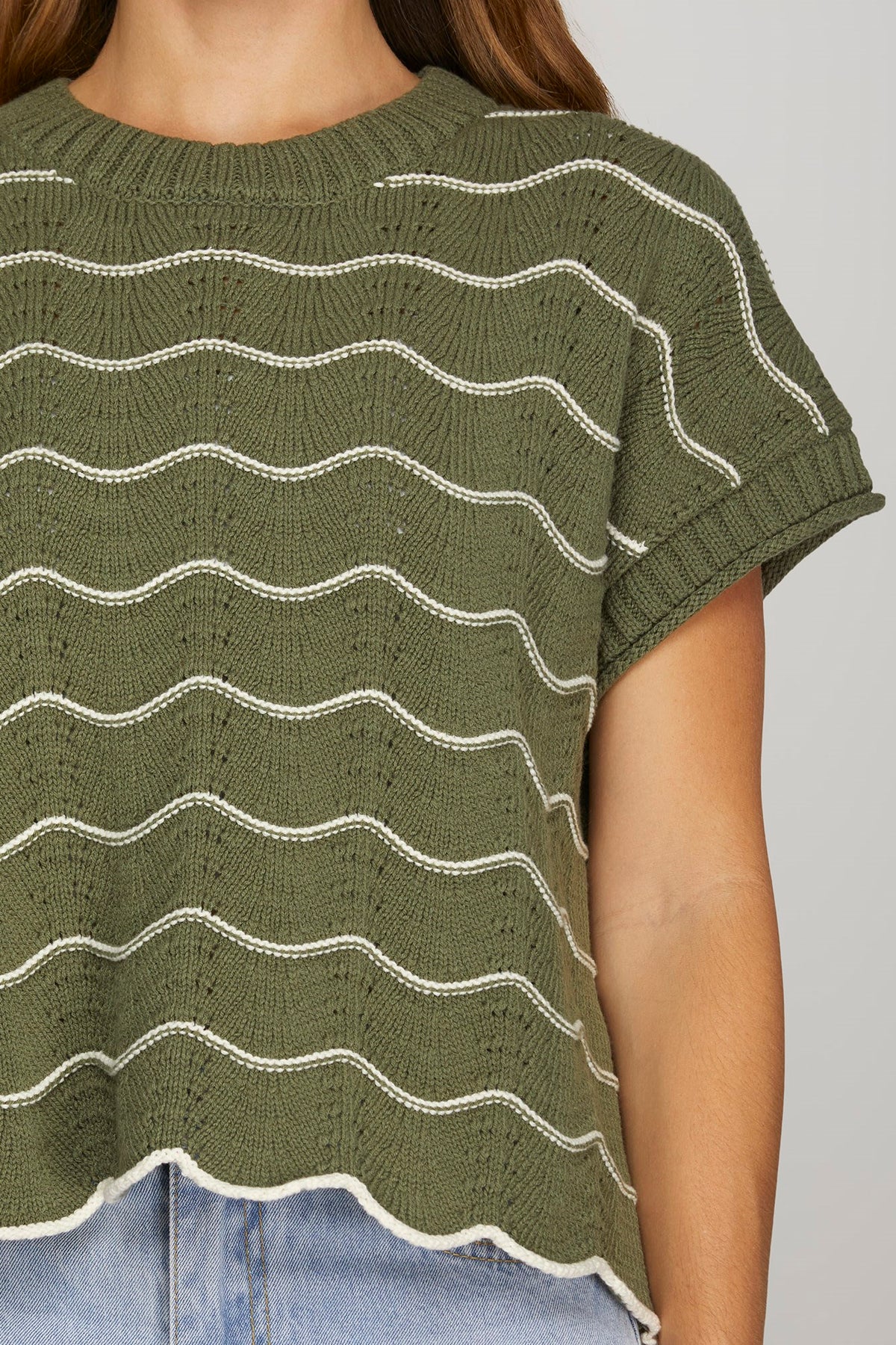 Regular price $48.00 Save $-48.00Adorable short-sleeve knit sweater featuring a charming scallop striped design. Perfect for layering or wearing solo, this playful piece brings a fun, textured vibe to any casual wardrobe. The wavy pattern adds movement and visual interest, while the relaxed fit keeps things comfy and effortless. A sweet staple that works year-round.