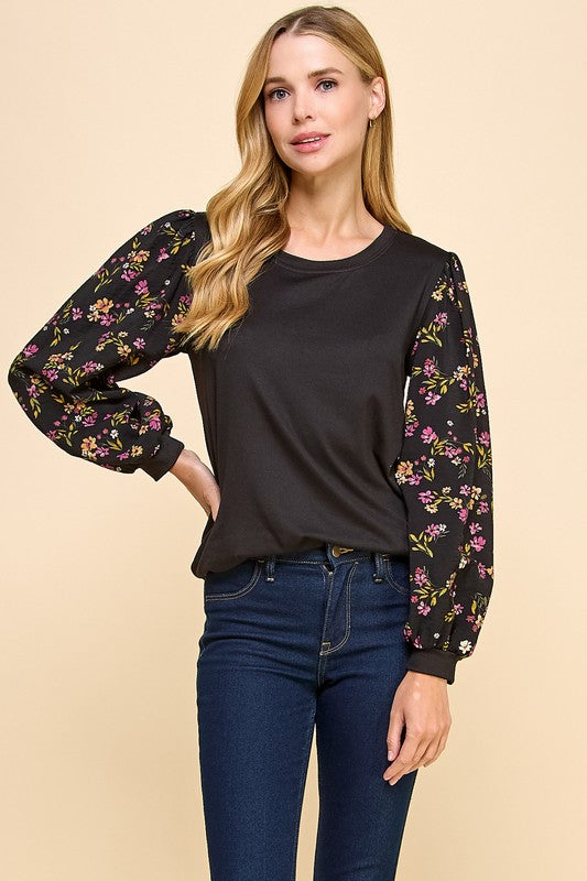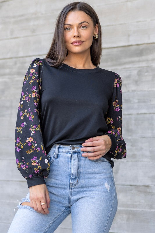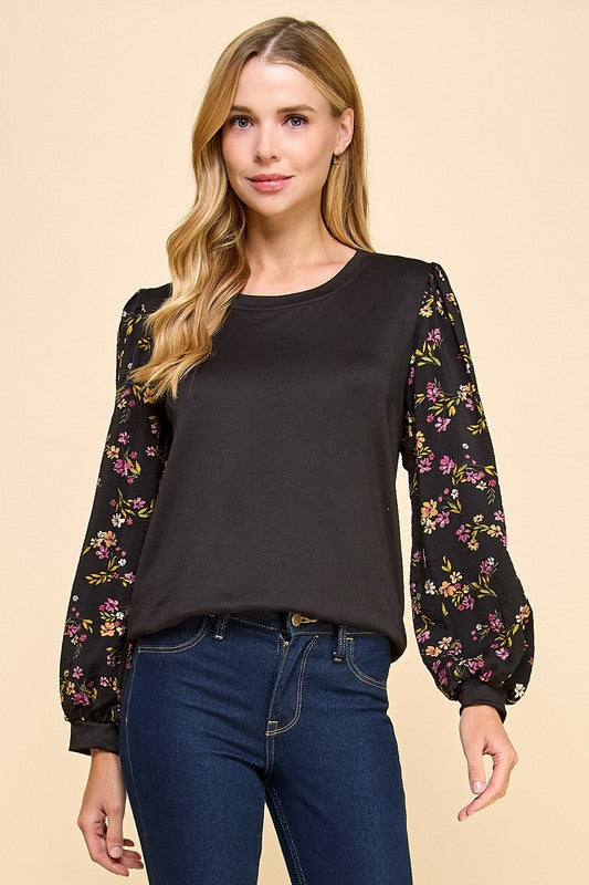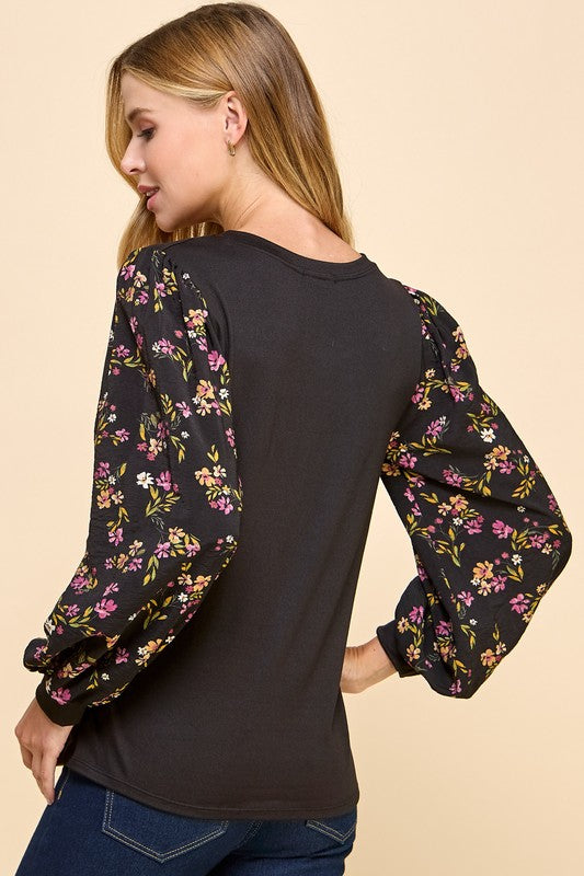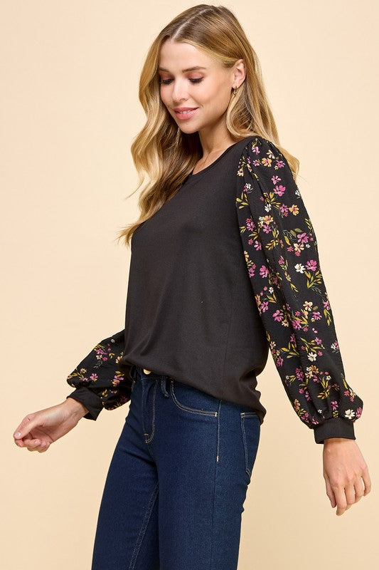 Regular price $32.00 Save $-32.00Make a statement effortlessly with this charming knit top featuring beautifully contrasting floral sleeves.